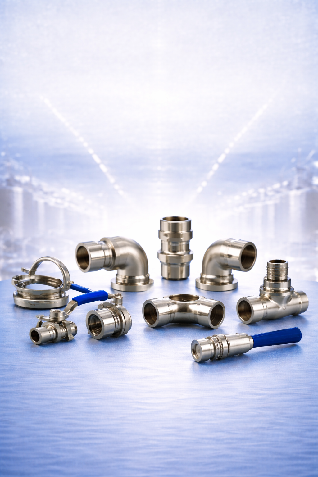 Tri‑clamp, threaded, and weld fittings in 304/316L for secure, leak‑free connections in sanitary piping systems.