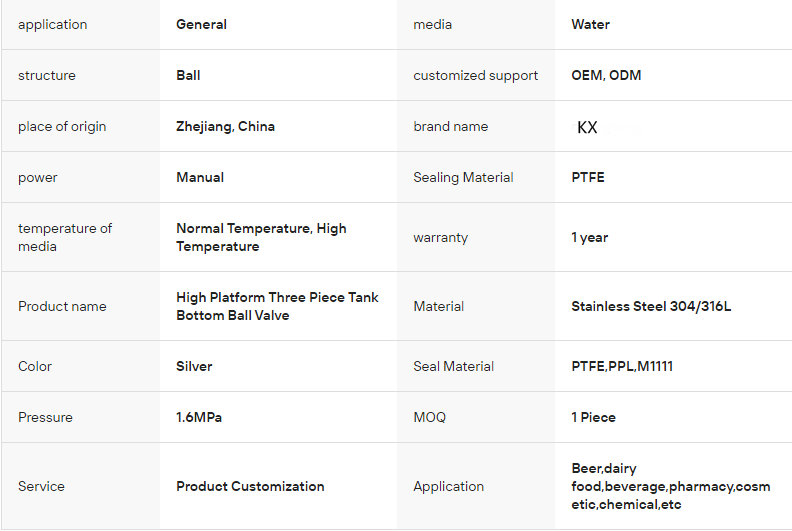 High Platform Three Piece Tank Bottom Ball Valve Stainless Steel 304/316L Manual Water High Temperature 1.6MPa Pressure OEM